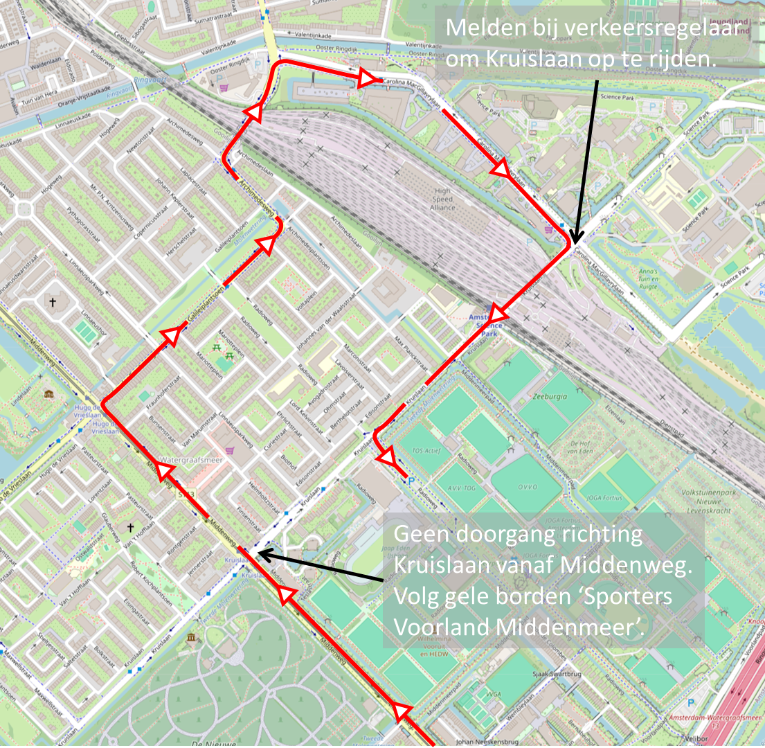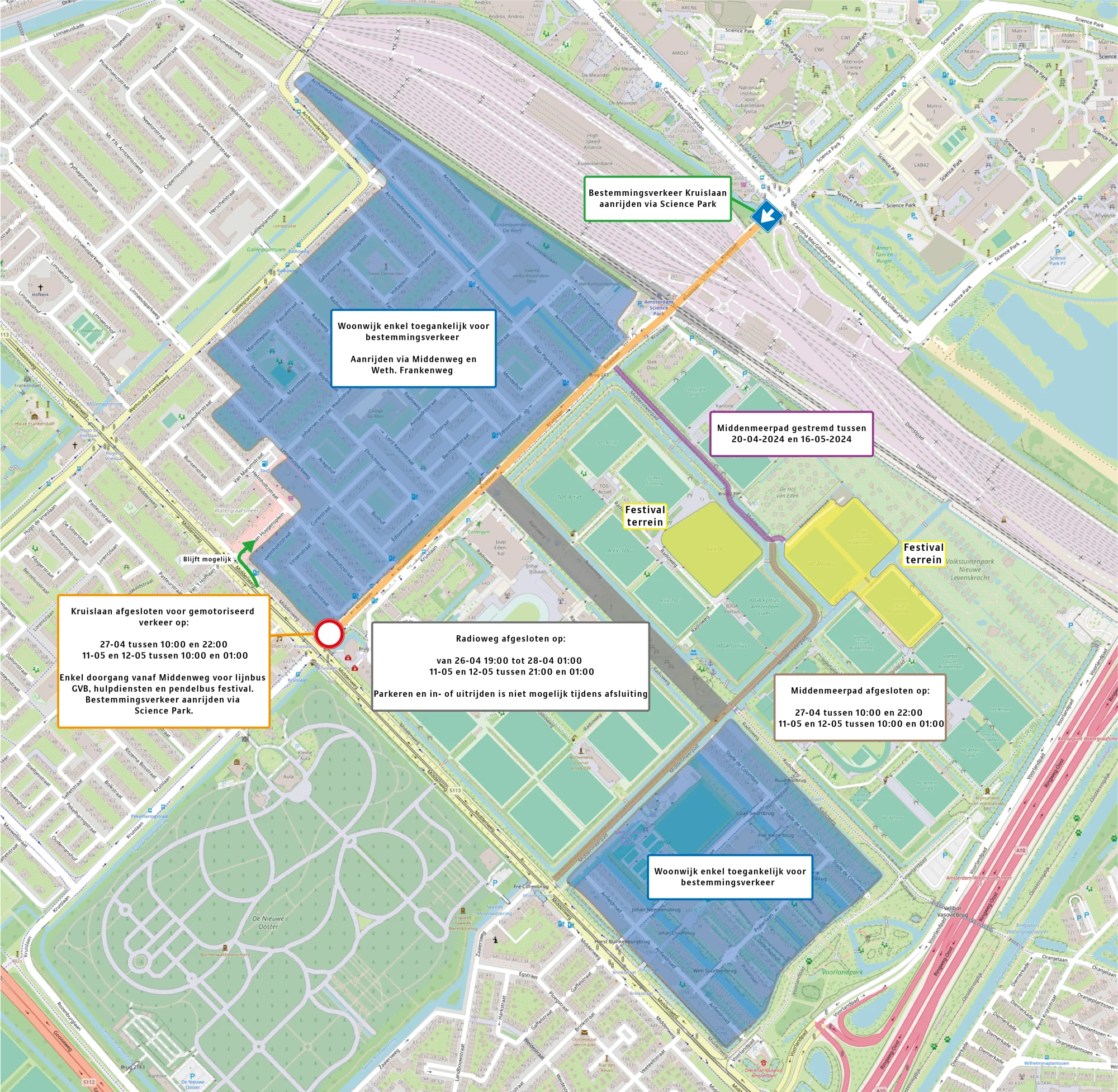 • Een deel van de woonwijken aan de noordzijde van de Kruislaan wordt afgesloten om te voorkomen dat autoverkeer (auto’s, taxi’s, besteld vervoer) overlast verzorgt in de wijken. Bewoners van de afgesloten wijken hebben hierover een aparte brief ontvangen inclusief doorrijsticker.